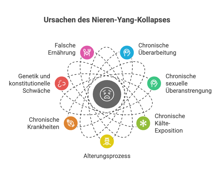 Das Yuan Qi wird kontinuierlich angezapft. Nach Jahren ist das Reservoir leer. Die Nieren-Yang bricht zusammen.