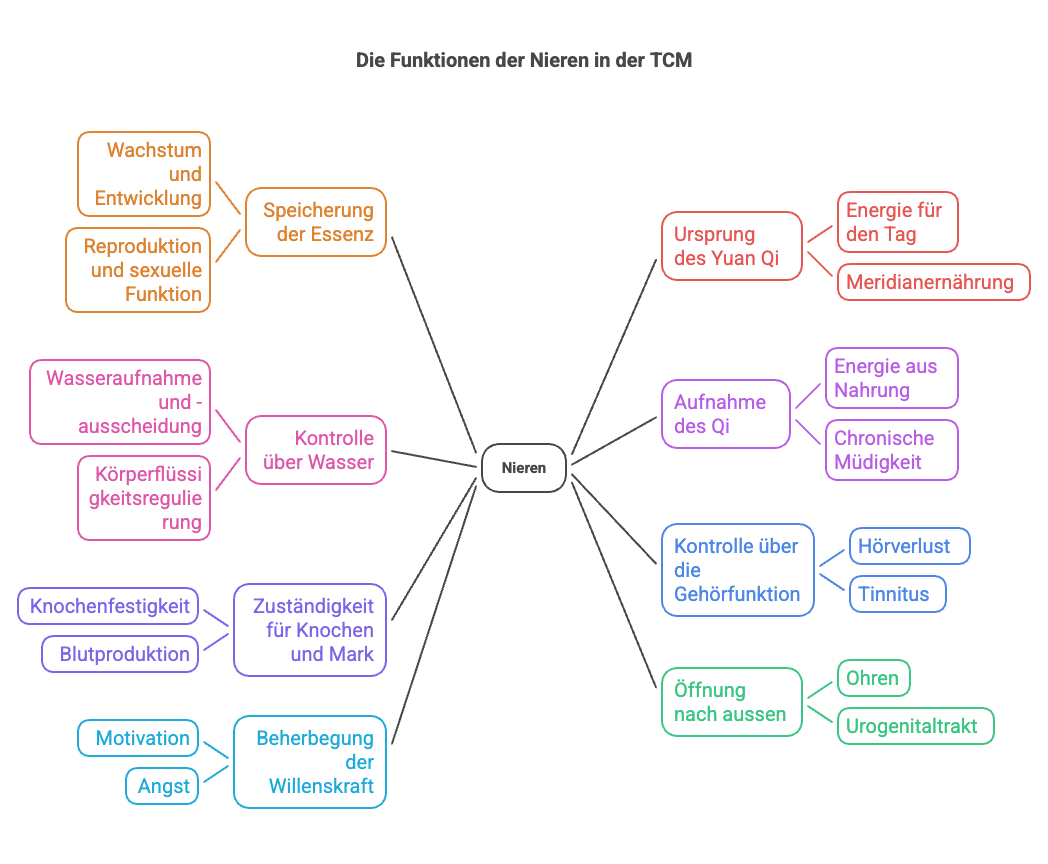 Die Nieren in der TCM sind das tiefste Energie-Reservoir des Menschen. Sie speichern das Yuan Qi – die angeborene Essenz, die Lebenskraft, den Funken des Lebens. Diese Essenz ist nicht erneuerbar wie das tägliche Qi. Sie ist wie ein Sparkonto – wenn sie leer ist, kann man nicht einfach mehr abheben.