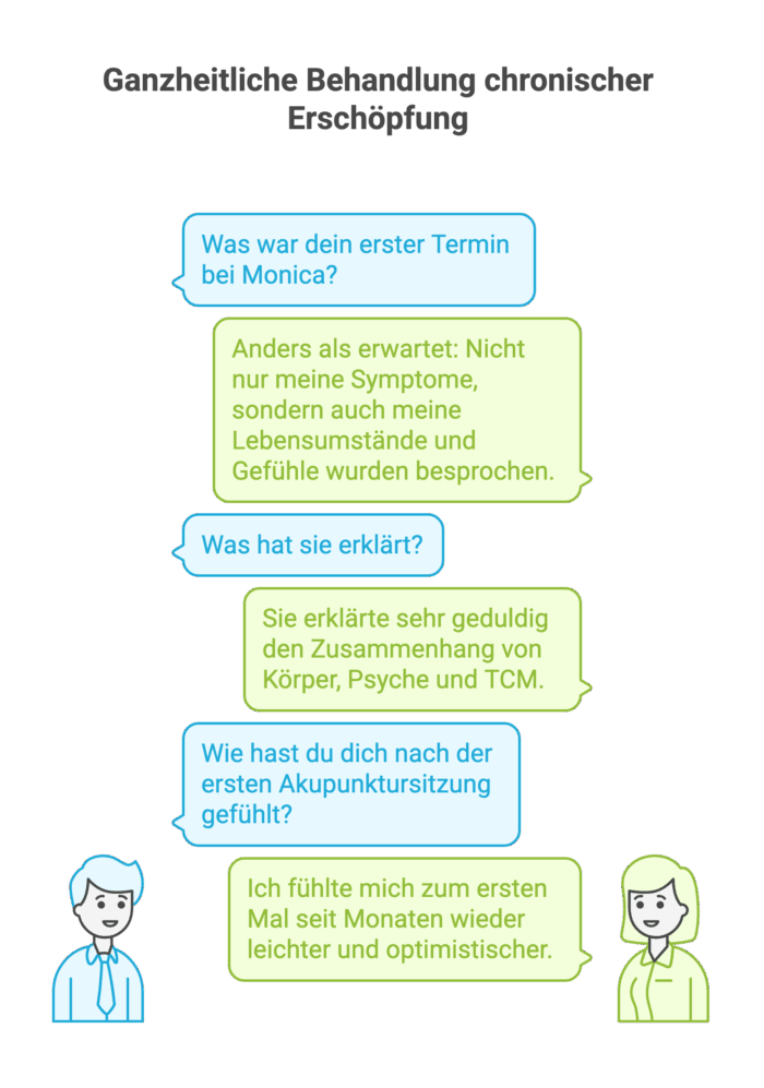 „Mein Ersttermin bei Monica war anders als erwartet: Nicht nur meine Symptome, sondern auch meine Lebensumstände und Gefühle wurden besprochen. Sie erklärte sehr geduldig den Zusammenhang von Körper, Psyche und TCM. Ich hatte sofort Vertrauen in ihre ruhige Art und die strukturierte Herangehensweise. Nach der ersten Akupunktursitzung fühlte ich mich zum ersten Mal seit Monaten wieder leichter und optimistischer. (M., 42)“