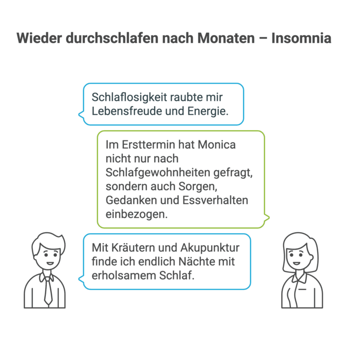 „Schlaflosigkeit raubte mir Lebensfreude und Energie. Im Ersttermin hat Monica nicht nur nach Schlafgewohnheiten gefragt, sondern auch Sorgen, Gedanken und Essverhalten einbezogen. Mit Kräutern und Akupunktur finde ich endlich Nächte mit erholsamem Schlaf. (G., 52)“
