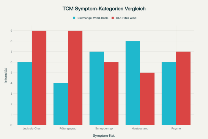 - Blut-Hitze mit Wind: Starke Rötung, juckende, trockene Schuppen, Phasenwechsel.